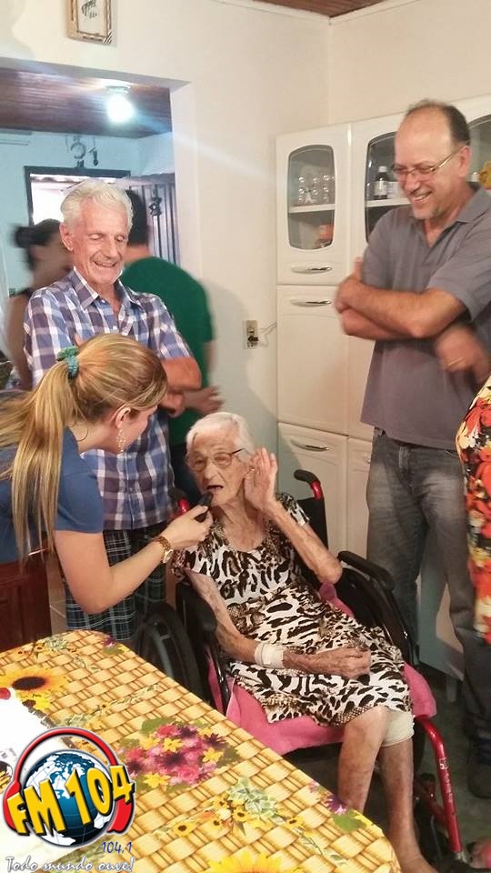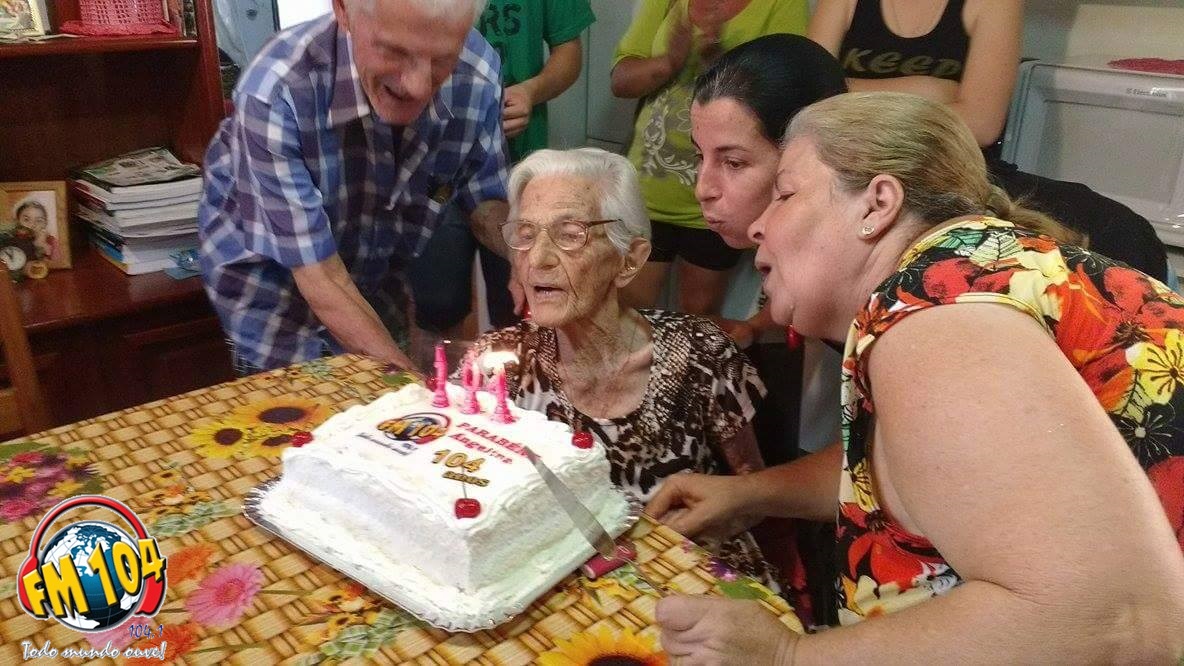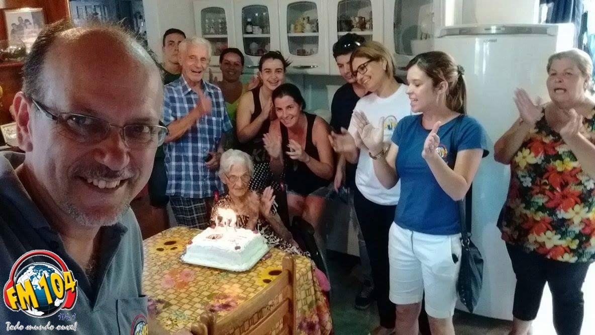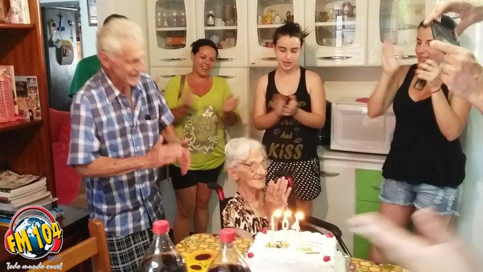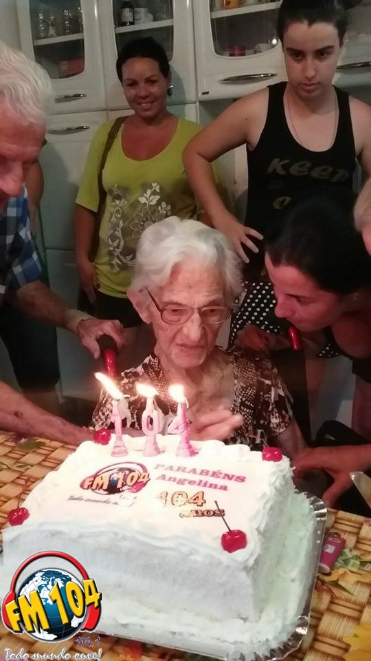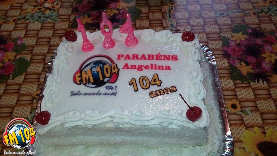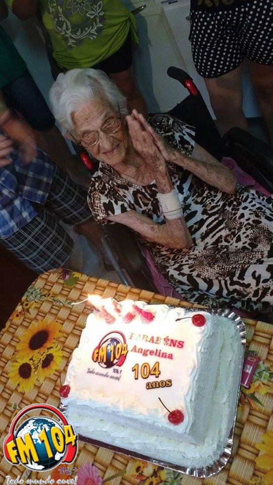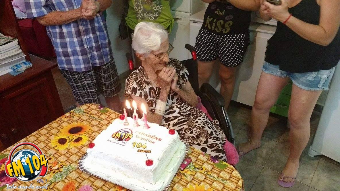 Dona Angelina moradora de Cornélio Procópio, no Jardim Primavera, completou no dia 16 de outubro 104 anos. Como não é todo dia que nos deparamos com pessoas nesta idade e também por este número ser tão significativo para a nossa emissora, uma equipe da Rádio FM 104 fez questão de parabenizar e levar o bolo de aniversário desta querida senhora.