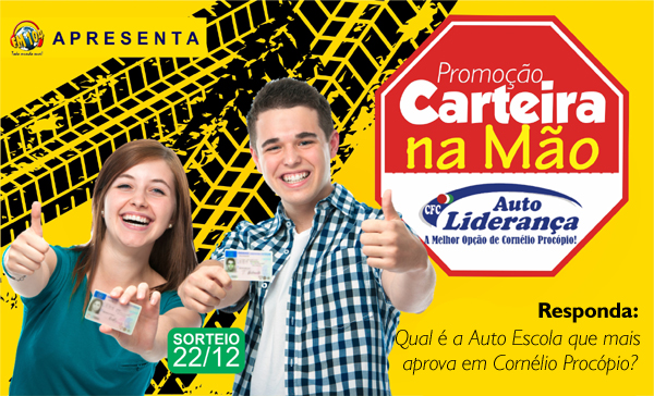 Chega de andar a pé! Nunca mais peça carona! A 104 - a rádio que mais dá prêmios no Paraná e a Auto Escola Liderança vão sortear uma carteira de habilitação categoria B, para carro. Preencha o cadastro e boa sorte!